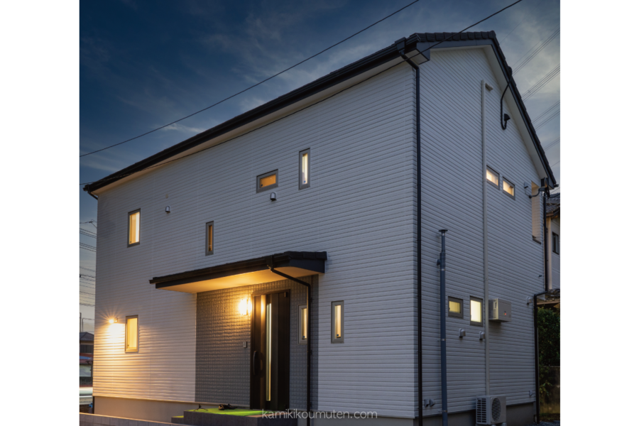 構造計算された耐震等級3で安心を、気密性能C値0.1、高断熱外張工法、太陽光発電でエネルギーを無駄なく使い床下、小屋裏エアコン1台で全館暖冷房の快適性と光熱費削減を実現した、家族が末永くつむぐ住まいです。