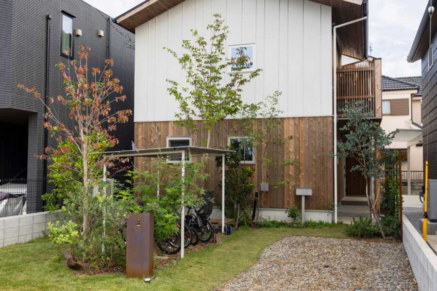 「雨に香る家」外装に⽤いた⽊材は飯能市で丁寧に製材されたやや光沢のある椹材です。⼀枚⼀枚丹念に施⼯してもらいました。 内装には調湿効果のある無垢フローリングと紙の壁紙を採⽤しています。 吟味した素材に包まれた空間は、時を経て、ご家族の成⻑や中庭の草⽊の⽣育と共に深みを帯びた姿に変化してい きます。