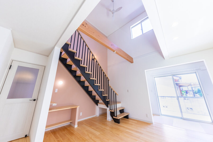 キッチン奥や、中央やや上に見える横幅の広い開口部がエアコンの吹き出し口。全館空調だから、リビング階段に仕切りがなくて大丈夫なのです。■4枚目