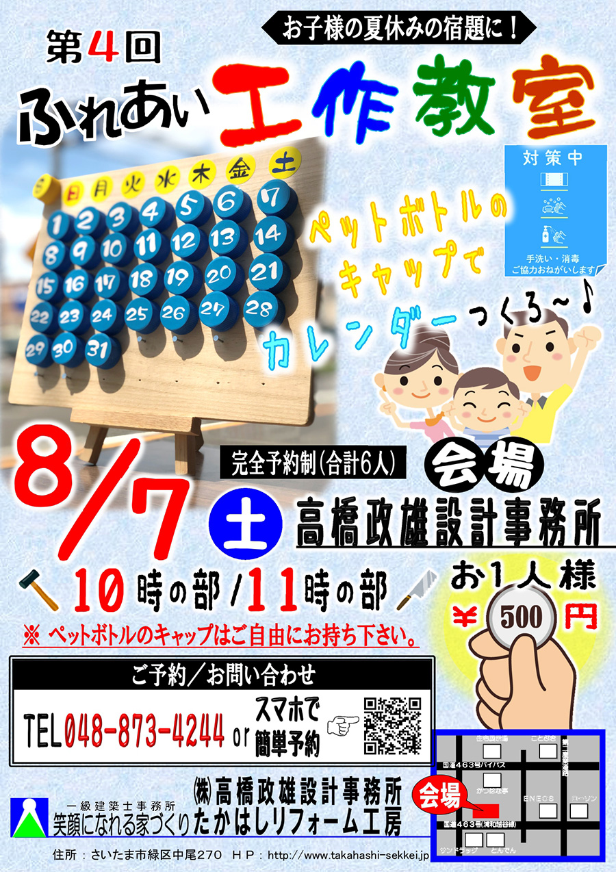 ■開催日時:2021年8月7日(土)10時〜 ■会場:㈱高橋政雄設計事務所 ■参加費:お一人様 500円 ■ご予約:048-873-4244 or 下記の「お申し込み」よりご予約ください。